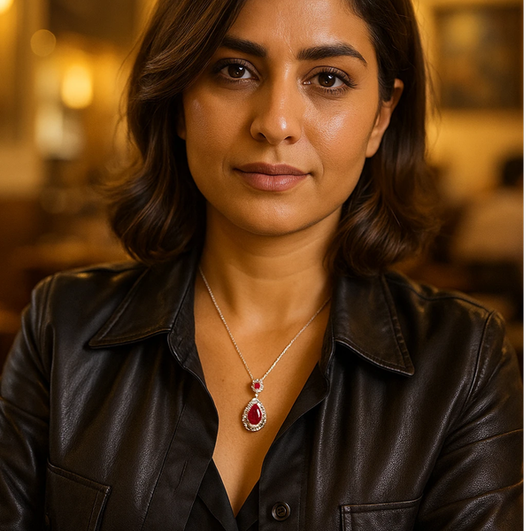 نگین اشکی قرمز در مرکز، با ریزنشانهای درخشان احاطه شده و جلوهای لوکس و زنانه به آن میبخشد. طراحی ظریف زنجیر باعث میشود گردنبند روی گردن بهزیبایی بنشیند و قابل ترکیب با هر نوع پوشش رسمی یا کژوال باشد.