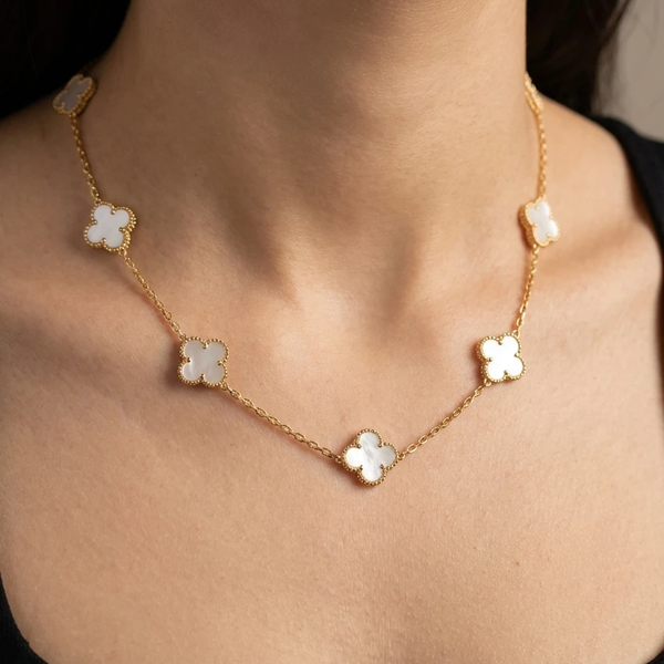 این گردنبند ونکلیف سفید با طراحی ظریف و مینیمالیستی از چندین پلاک شبدر (کلاور) که با صدف سفید تزیین شده، یک انتخاب بی‌نظیر برای کسانی است که به دنبال زیورآلات شیک و لوکس هستند. هر پلاک شبدر به دقت در زنجیری طلایی متصل شده و زیبایی خاصی به گردن می‌بخشد. این طراحی با استفاده از ترکیب طلایی و صدفی، حالتی کلاسیک و در عین حال مدرن دارد که می‌تواند به راحتی با انواع استایل‌ها، از استایل‌های روزمره گرفته تا لباس‌های مجلسی، هماهنگ شود.